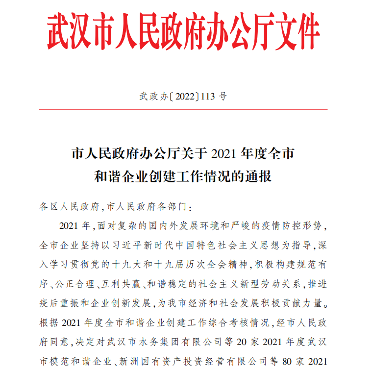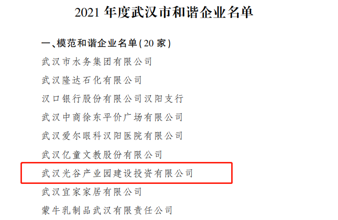 近日,武漢市人民政府辦公廳發(fā)布了《2021年度全市和諧企業(yè)創(chuàng)建工作情況的通報(bào)》,武漢光谷產(chǎn)業(yè)園建設(shè)投資有限公司繼榮獲武漢市和諧企業(yè)、職工心靈加油站稱號后,獲評“2021年度武漢市模范和諧企業(yè)”榮譽(yù)稱號。
